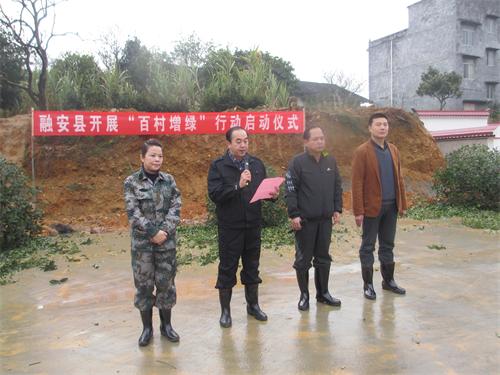 为加快融安县村屯绿化建设的步伐,实现乡村普遍增绿,生态环境明显改善,生态效益显著提升的目标,营造"一个村屯一座绿岛"的生态美景,落实《关于迅速开展"百村增绿"行动掀起村屯绿化活动新高潮的紧急通知》(桂林绿发字〔2015〕2号)及自治区冬春水利建设指挥部、自治区绿委《关于开展"兴水利、种好树、优生态、惠民生"主题活动的通知》(桂冬修〔2015〕1号)的文件精神,扎实推进"美丽融安"乡村建设,营造生态乡村活动良好氛围,掀起开展"百村增绿"的行动高潮。2015年2月15日上午,融安县在长安镇塘寨村举行 "百村增绿"行动启动仪式。